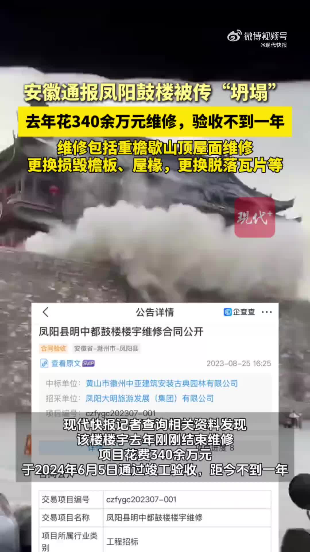 5月19日,有网传视频显示,安徽省凤阳县鼓楼的楼宇顶部发生坍塌。当晚,凤阳县文化和旅游局发布通报称,5月19日下午6时30分许,凤阳县鼓楼楼宇(1995年重建)顶部一侧瓦片部分脱落,无人员伤亡。相关情况正在调查中。记者注意到,凤阳县明中都鼓楼楼宇曾于去年完成维修,其竣工验收距今不到一年,根据维修合同显示,花费341.206万元。(via 现代快报)