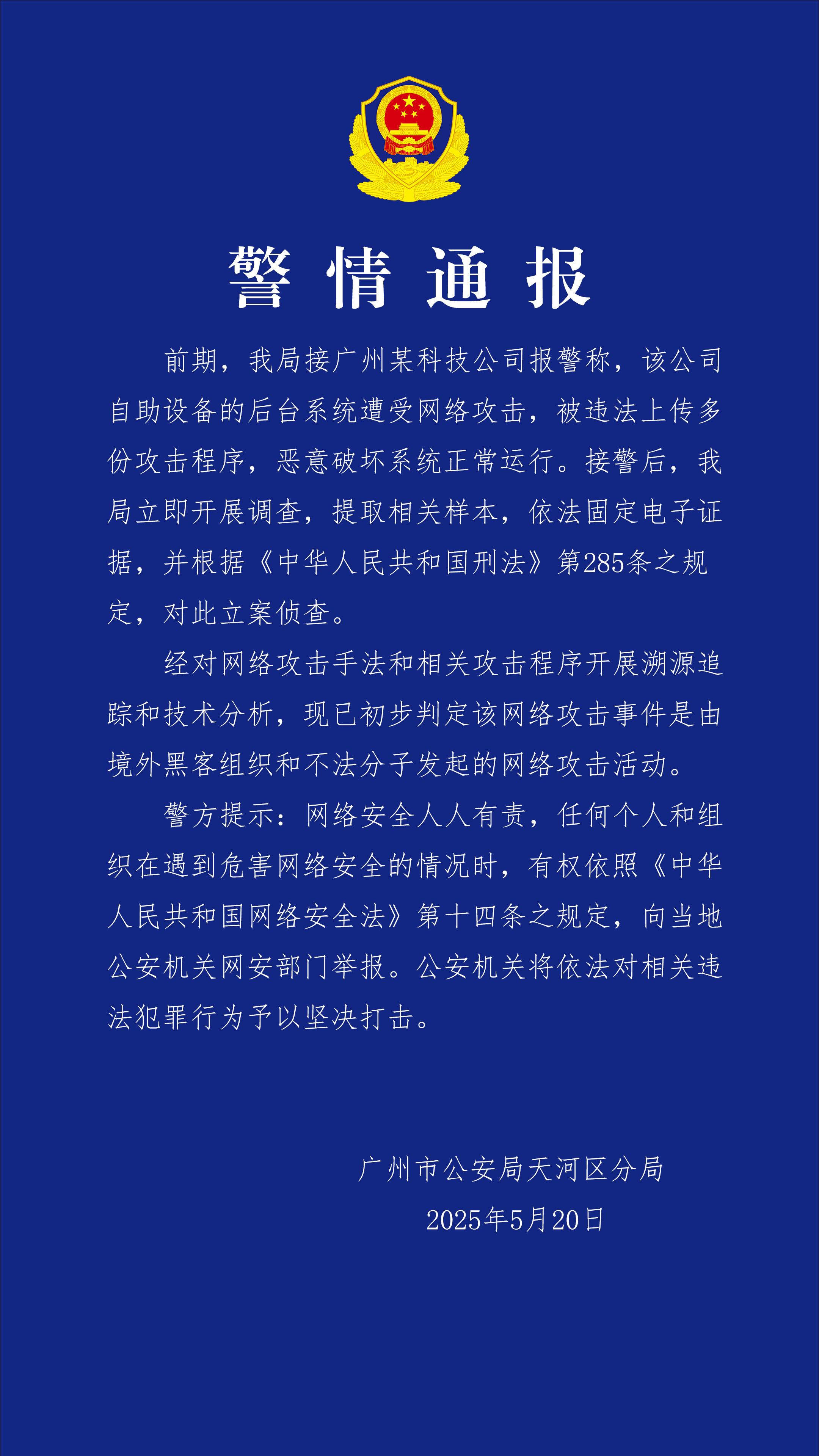 据澎湃,5月20日上午9时,广州市公安局天河区分局官方微博发布警情通报称,广州某科技公司自助设备的后台系统遭受网络攻击并被上传多份恶意代码。接警后,公安机关立即开展调查,提取相关样本,依法固定电子证据。经对网络攻击手法和相关恶意代码样本开展技术分析,现已初步判定该事件为境外黑客组织发起的网络攻击活动。