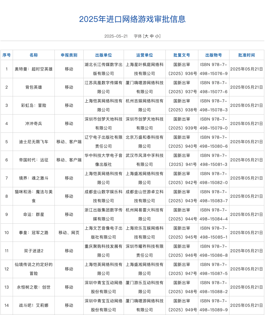 5月21日,国家新闻出版署发布2025年网络游戏审批信息,5月共130款国产网络游戏获批,共14款进口游戏获批。