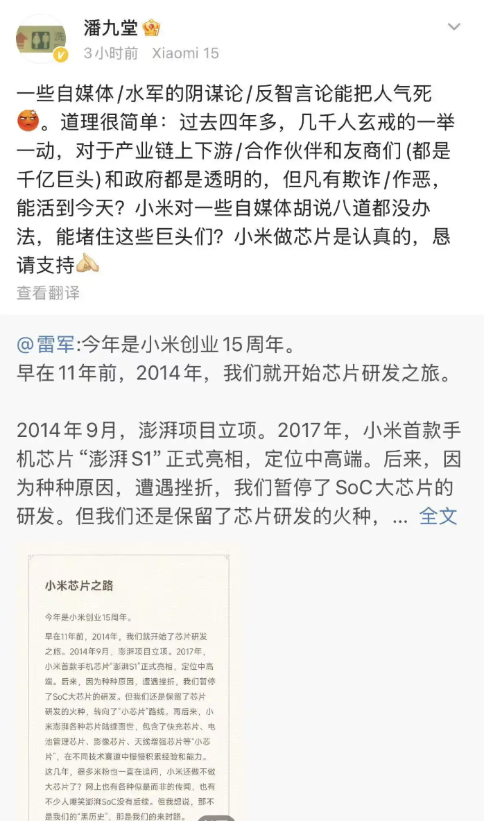 他表示:“过去四年多,几千人玄戒的一举一动,对于产业链上下游/合作伙伴和友商们(都是千亿巨头)和政府都是透明的,但凡有欺诈/作恶,能活到今天?小米对自媒体胡说八道都没办法,能堵住这些巨头们?小米做芯片是认真的,恳请支持。”