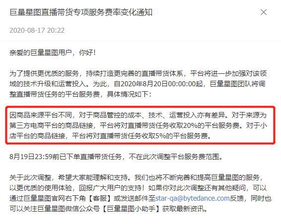 8月17日巨量星图发布最新“直播带货”专项服务费率变化通知。对来源为第三方电商平台的商品链接,平台将对直播带货任务收取20%平台服务费。对小店平台的商品链接,平台将对直播带货任务收取5%的平台服务费。