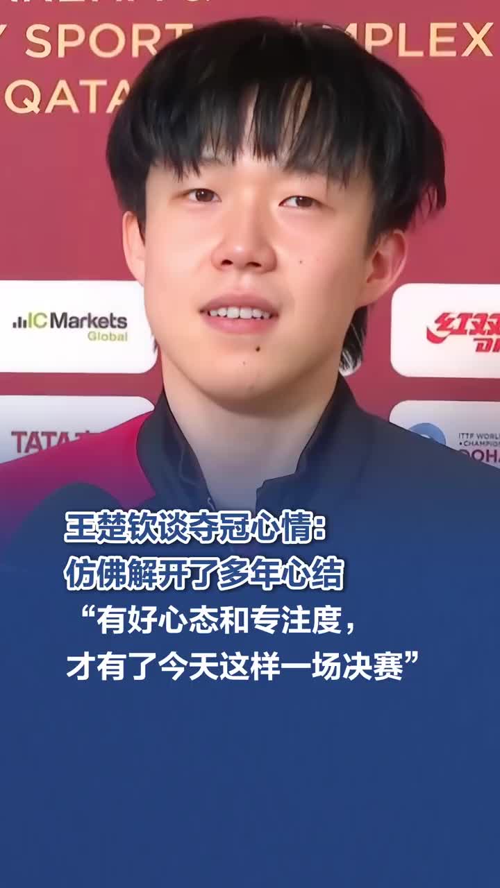 2025多哈世乒赛男单决赛,王楚钦战胜了雨果,夺得冠军。赛后采访中,当被问到当下心情,王楚钦说:“仿佛心头多年的结,解开了。”对于这场比赛,他一直对自己说没有压力,“就像平常的比赛。正因为有这样的心态、专注度,才有了今天这样一场决赛。”(via 北京日报都视频)