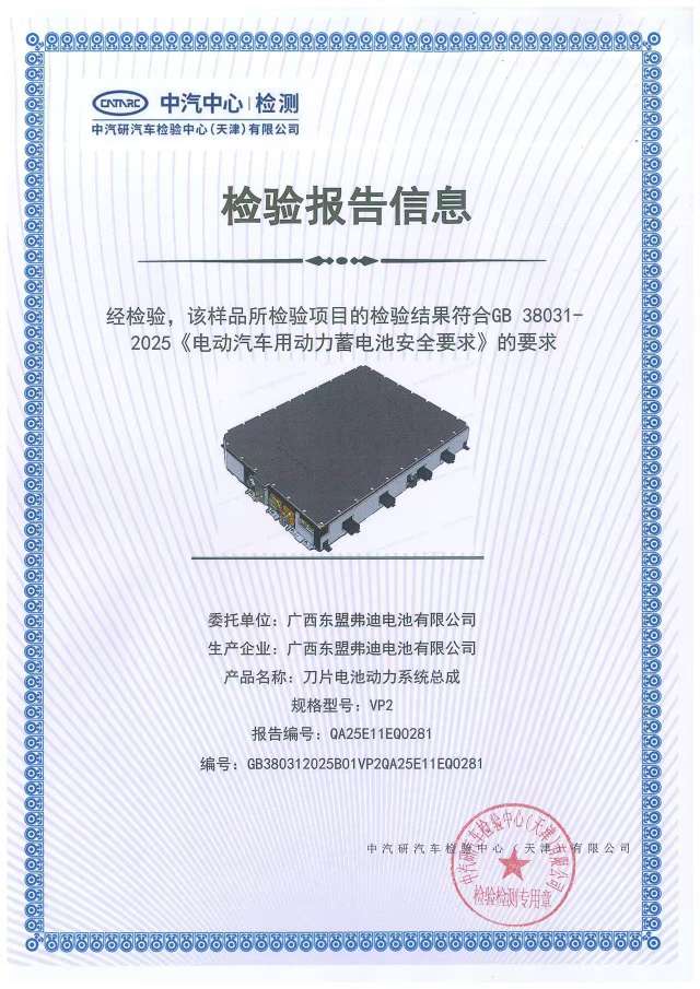 近日,比亚迪刀片电池和闪充刀片电池双双提前通过最新国标GB 38031-2025《电动汽车用动力蓄电池安全要求》全项检测,并获得中汽研汽车检测中心专业认证证书,提前满足新国标要求。