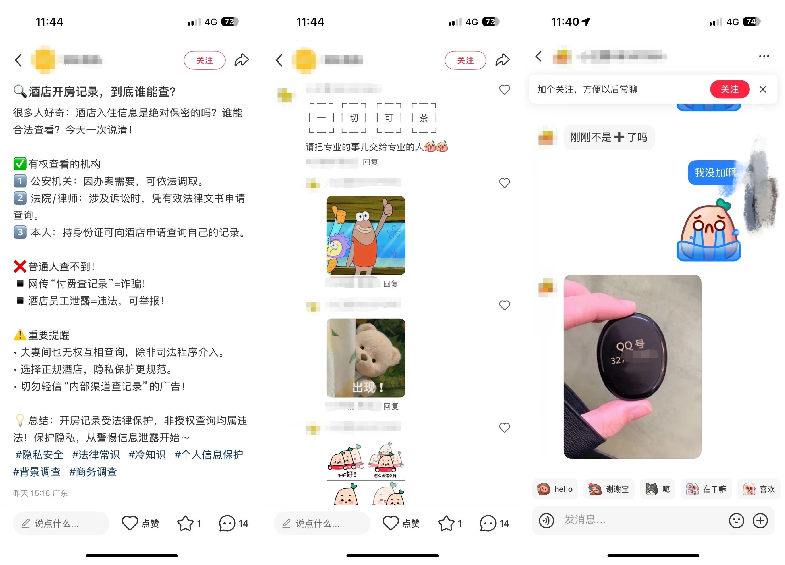 北京商报记者在一家主流社交平台上,以“私人侦探”“定位查人”为关键词检索发现,尽管大量笔记明确标注“非法获取他人信息属违法行为”等警示内容,但其评论区仍存在隐秘的招揽信息。部分账号以隐晦话术留言“有渠道”“可解决”,引导用户私聊。