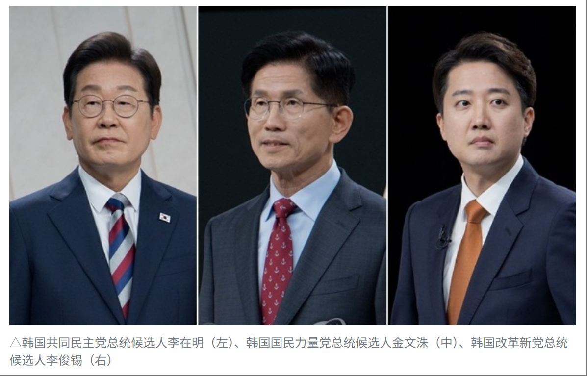 韩国最大的在野党共同民主党总统候选人李在明持续领跑各调查机构关于下届总统热门人选的民调,截至28日的最新统计数据,李在明的支持率仍旧保持在40%-50%左右;随后是执政党推出的总统候选人金文洙,支持率维持在30%-40%之间,距离李在明的差距为超出误差范围的10个百分点左右;曾任执政党党首的年轻候选人李俊锡此次以改革新党候选人身份参与竞选,支持率在10%左右。6月3日正式投票结束后,大选结果预计将于4日最终确认,胜出者也将于同一天宣布就任新一届韩国总统。