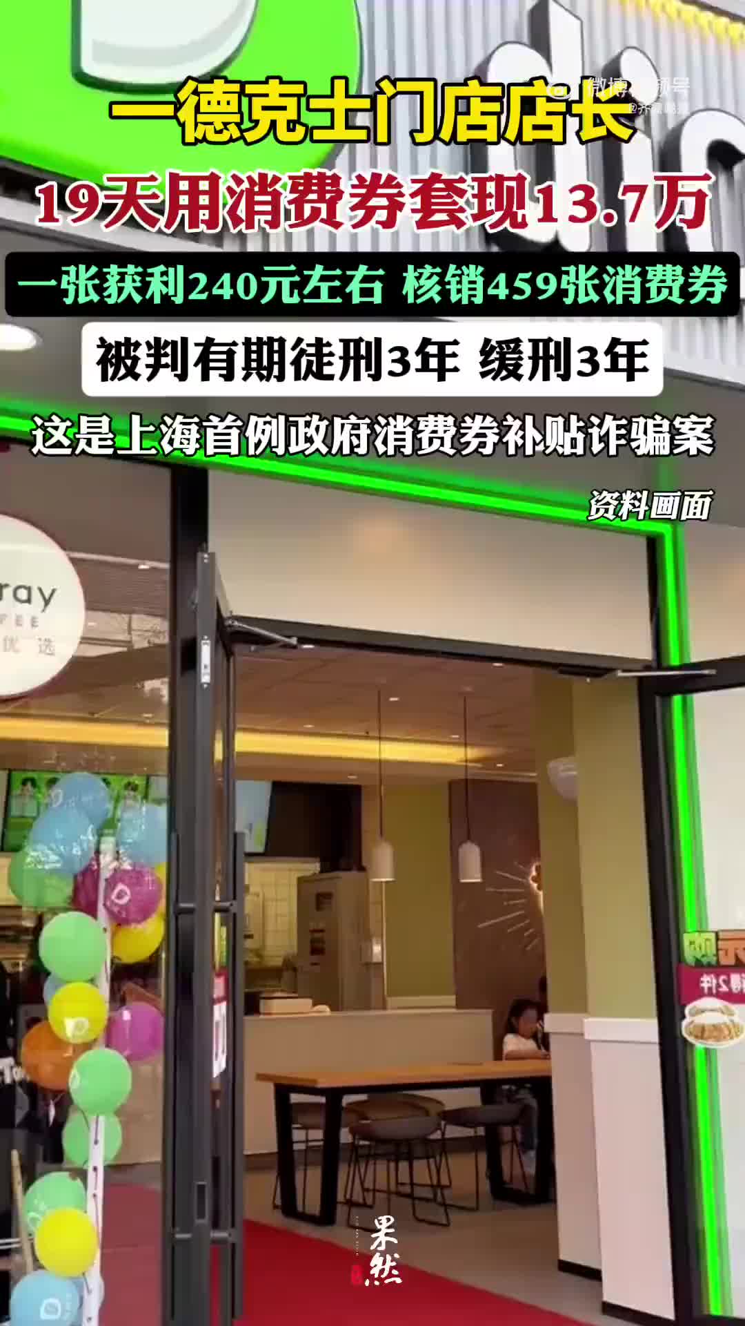 一德克士店长用消费券套现13.7万,被判有期徒刑3年,缓刑3年。