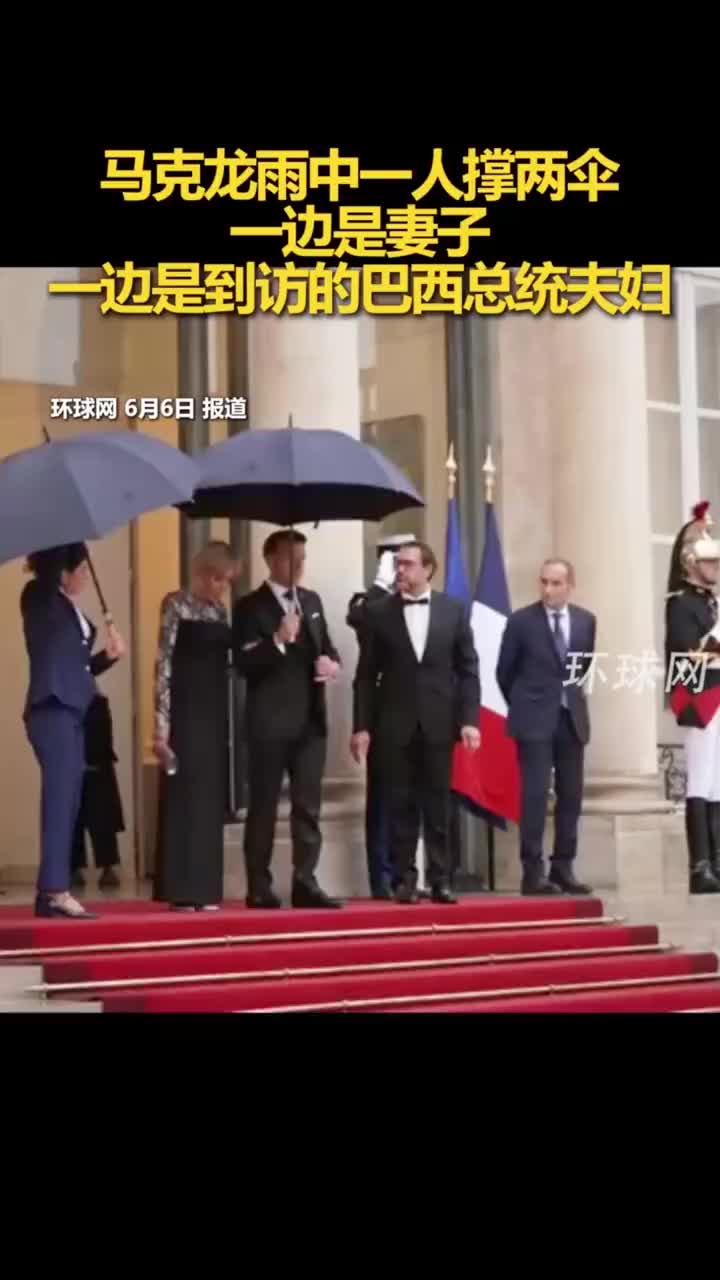 法国总理马克龙雨中一人撑两伞,一边是妻子,另一边是到访的巴西总统夫妇。 ​​​ (via 微天下)
