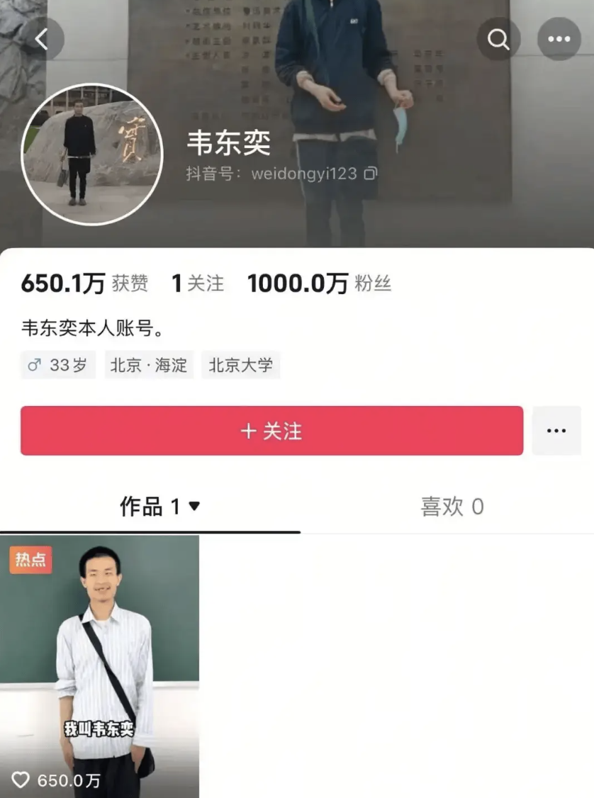 6月5日晚,北京大学的韦东奕老师开通个人社交平台账号,发布视频和网友打招呼,吸引粉丝无数。截至6月7日凌晨,韦东奕账号粉丝已突破1000万。