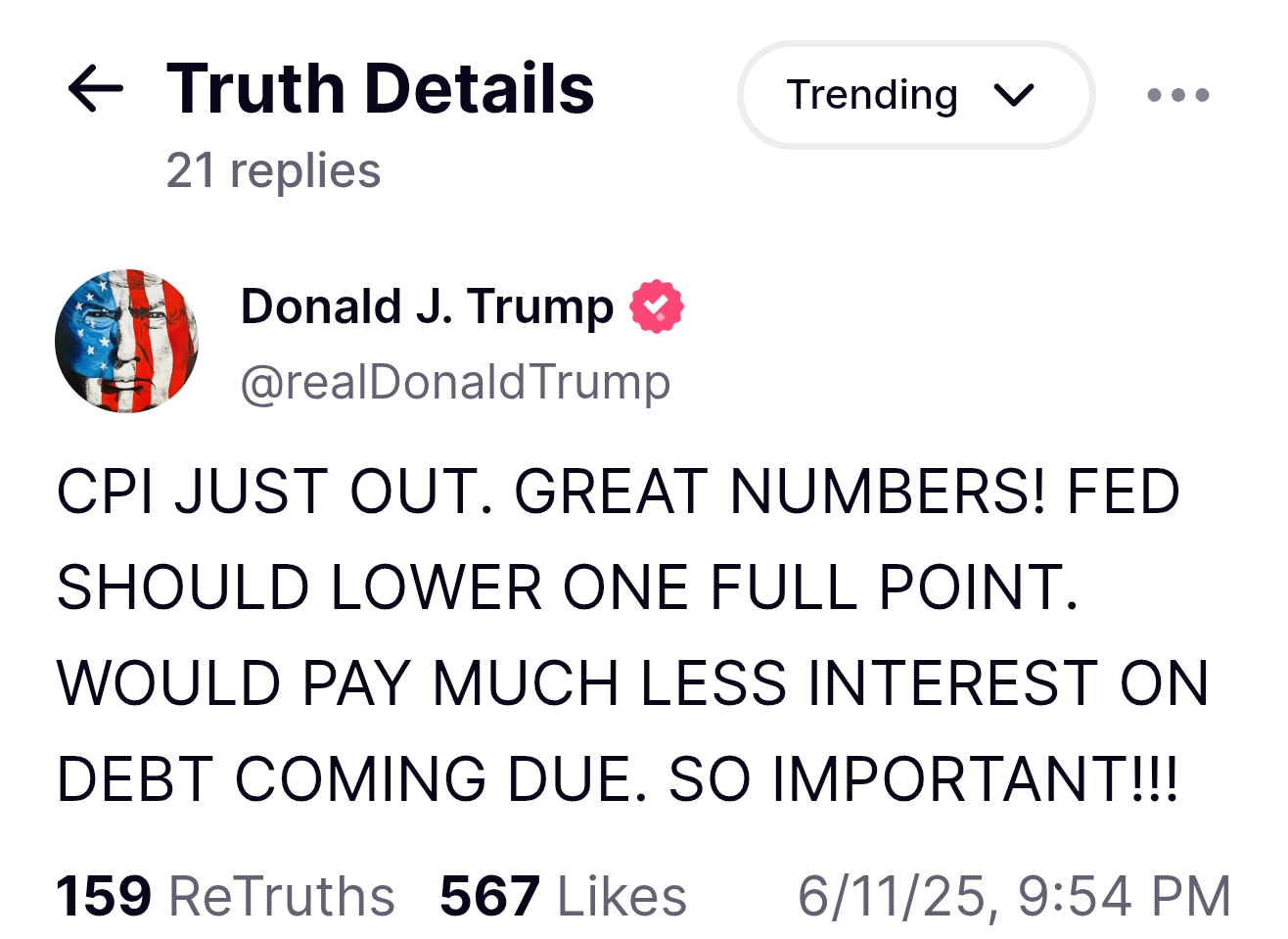 美国总统特朗普在社交媒体最新发文:“CPI数据刚刚公布,数据非常好!美联储应该降息整整1%。这样到期债务的利息支付就会少很多。这非常重要!”