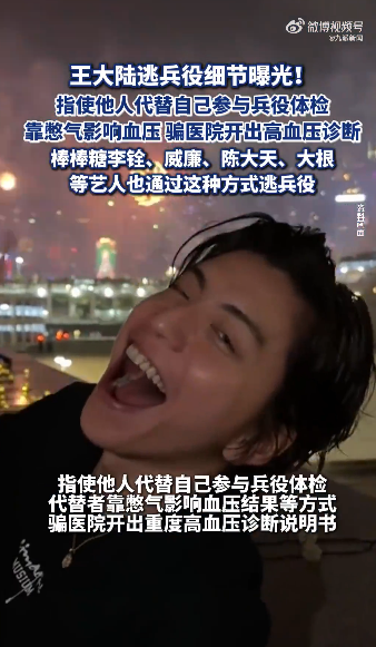 王大陆逃兵役细节曝光,指使他人代替体检,代替者靠憋气影响血压结果,多名艺人效仿。