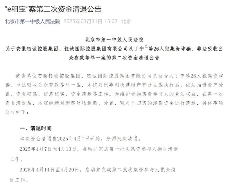 据九派新闻综合,“暴雷”十年后,“e租宝”终于迎来第二次资金清退。