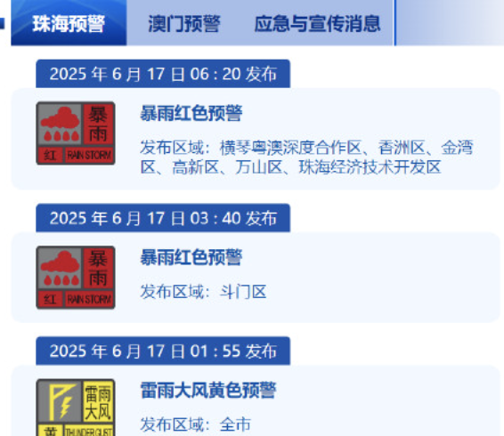 珠海市气象台已于6月17日6时20分发布全市暴雨红色预警信号,全市雷雨大风黄色预警信号继续生效。据珠海市教育局发布的消息,珠海非全寄宿制托育机构、幼儿园、中小学校、中等职业学校、高等院校、校外培训机构全天停课。