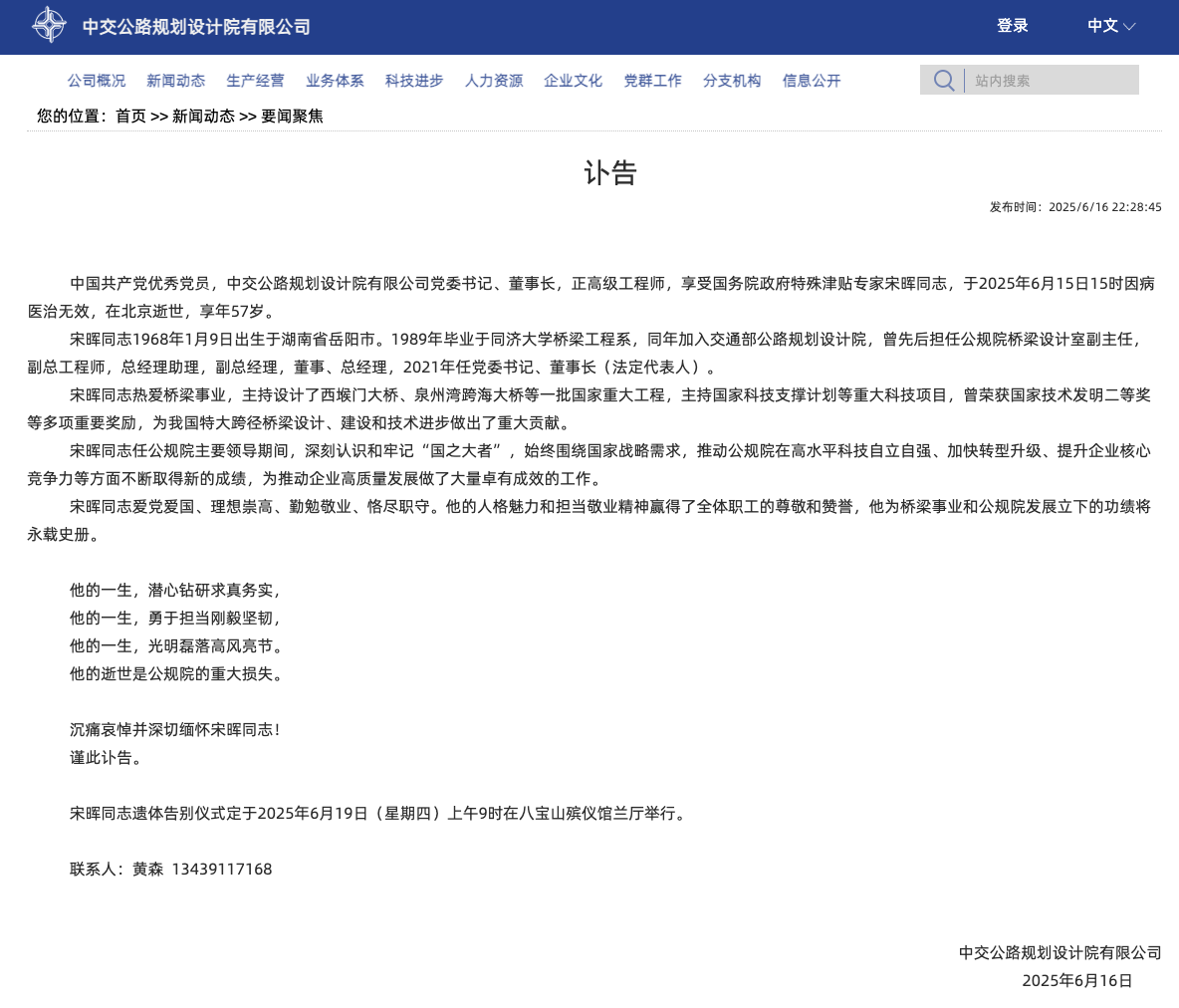6月16日晚间,中交公路规划设计院有限公司发布讣告:中国共产党优秀党员,中交公路规划设计院有限公司党委书记、董事长,正高级工程师,享受国务院政府特殊津贴专家宋晖同志,于2025年6月15日15时因病医治无效,在北京逝世,享年57岁。