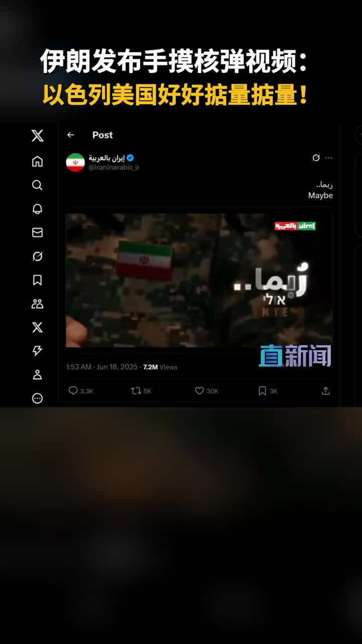 伊朗媒体当地时间6月18日在社交平台X上发布一段影片,画面显示一名身着军装的男子缓慢抚摸一枚核弹头,旁边用阿拉伯文和英文标示“有可能”(Maybe)字样,影片颇具恐吓意味。 (via 直新闻)
