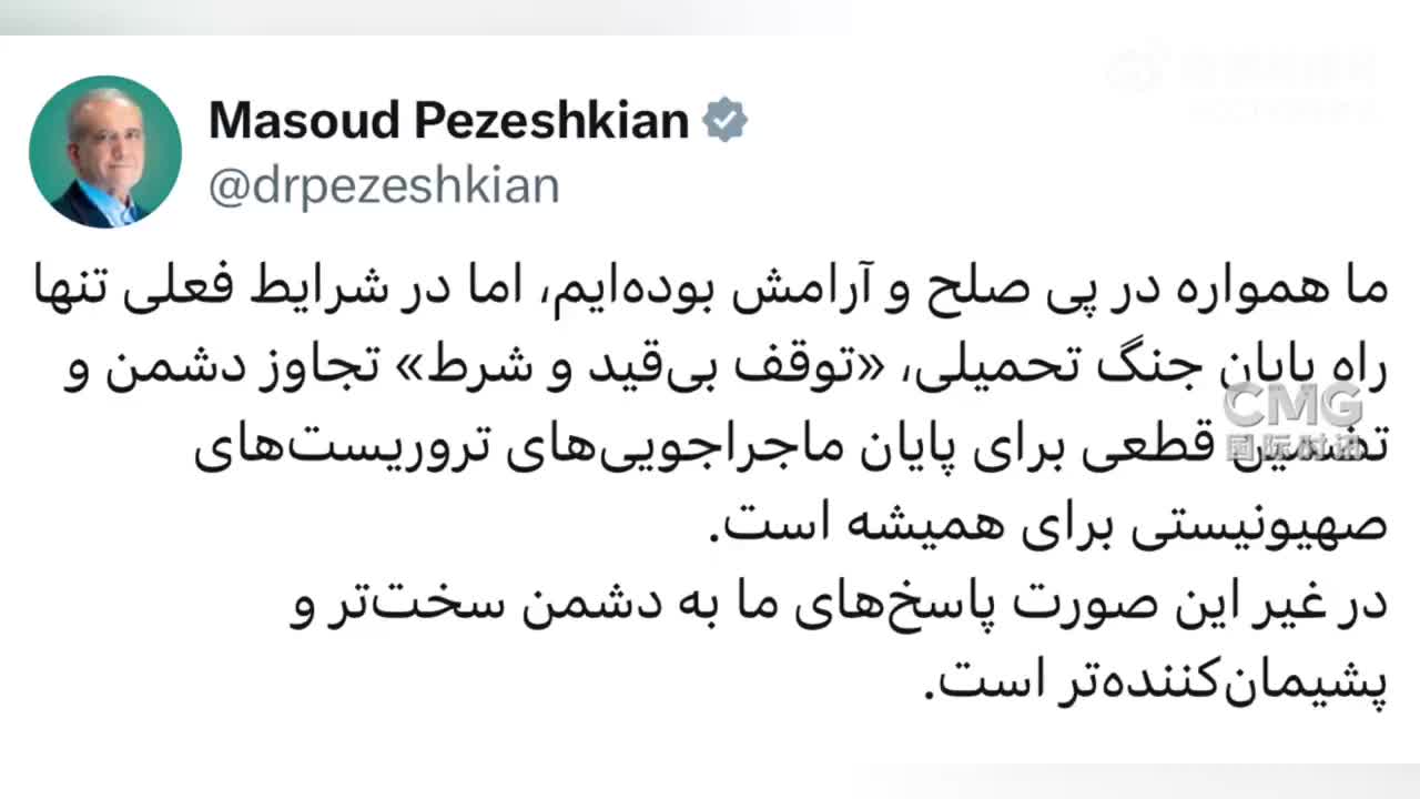 伊朗总统佩泽希齐扬今天(6月20日)在社交媒体上发文称,伊朗始终寻求和平与安宁,但在当前的形势下,结束强加给伊朗战争的唯一方法是以色列“无条件停止”侵略,同时必须保证能够一劳永逸地结束“以色列的冒险行径”,否则,伊朗对敌人的回应将“更加严厉”,将让敌人“感到后悔”。 (via CCTV国际时讯)