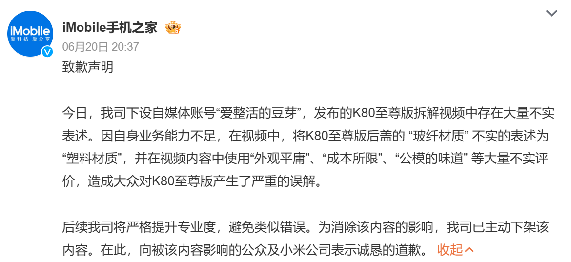 6月20日,@iMobile手机之家 就下设自媒体账号“爱整活的豆芽”对小米K80至尊版拆解视频存在大量不实表述发布致歉声明: