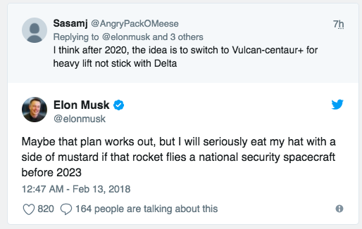 马斯克发布Twitter消息称,他敢于打赌,竞争对手的火箭不可能在2023年之前承担美国的国家安全太空飞船发射任务;如若不然,他“把帽子吃了”(eat my hat)。