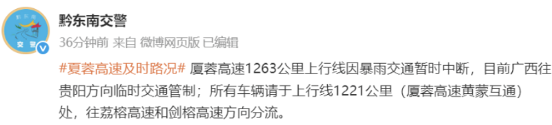 据贵州省黔东南州公安局交通警察支队官方微博消息,厦蓉高速1263公里上行线因暴雨交通暂时中断,目前广西往贵阳方向临时交通管制;所有车辆请于上行线1221公里(厦蓉高速黄蒙互通)处,往荔榕高速和剑榕高速方向分流。