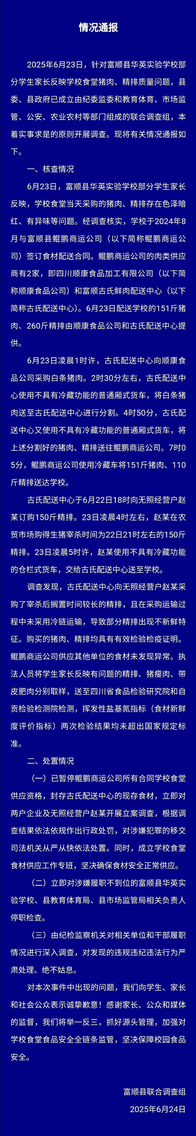 2025年6月23日,针对富顺县华英实验学校部分学生家长反映学校食堂猪肉、精排质量问题,县委、县政府已成立由纪委监委和教育体育、市场监管、公安、农业农村等部门组成的联合调查组,本着实事求是的原则开展调查。现将有关情况通报如下。