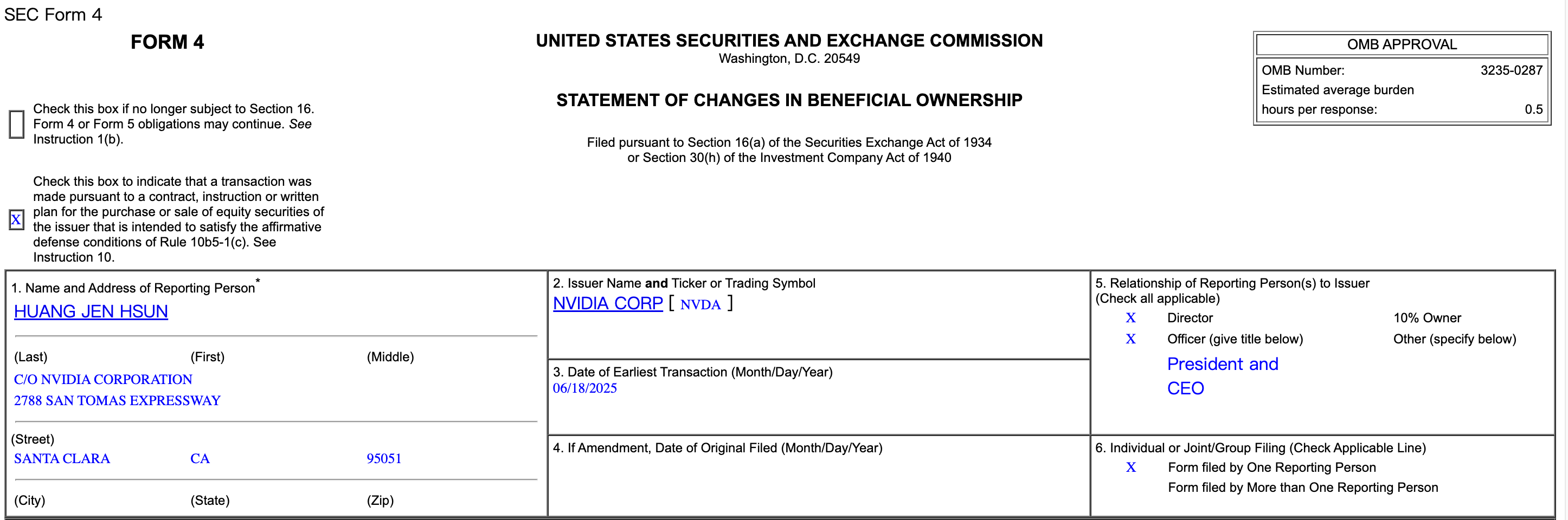 英伟达当地时间6月23日向美国证监会提交文件显示,公司CEO黄仁勋在6月20日和23日两天共出售10万股英伟达股票,总价近1440万美元。文件称,黄仁勋此次出售股份套现是报告人于3月采用的“10b5-1规则交易计划”对一部分。
