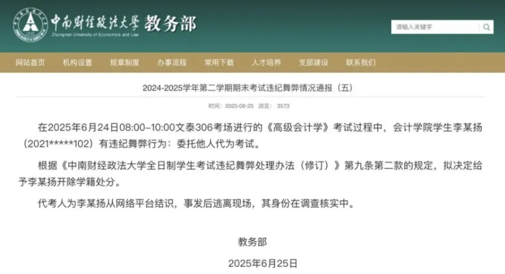 据扬子晚报,6月25日晚,中南财经政法大学教务部官网发布情况通报,全文如下: