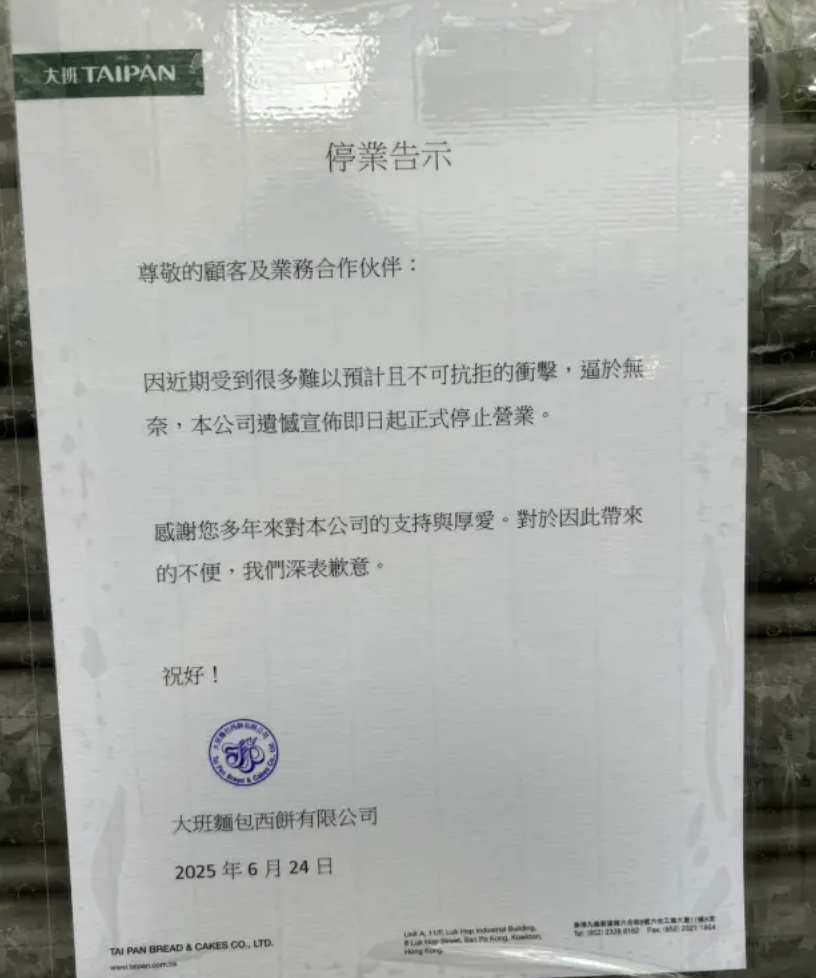 当天,大班面包西饼位于旺角亚皆老街、香港仔中心、葵芳盛芳街、北角英皇道等地的分店均没有开门,铁闸上更贴出告示,宣布公司24日起停业。