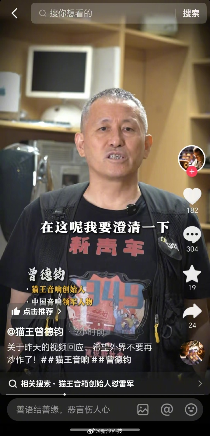据新浪科技,猫王音响创始人曾德钧就昨日发视频称雷军“网上形象高大上私下表现拙劣”一事回应称,“我对小米对雷军个人没有什么意见,没有其他的意图,在我身边的朋友也有在用小米的,虽然我自己没有用,并不表示产品不好,小米也是这些年成长起来的一家互联网企业,也受到大家的认同和喜欢,我希望我们所有的中国企业都能够不断前进发展,能够代表中国把产品越做越好。”
