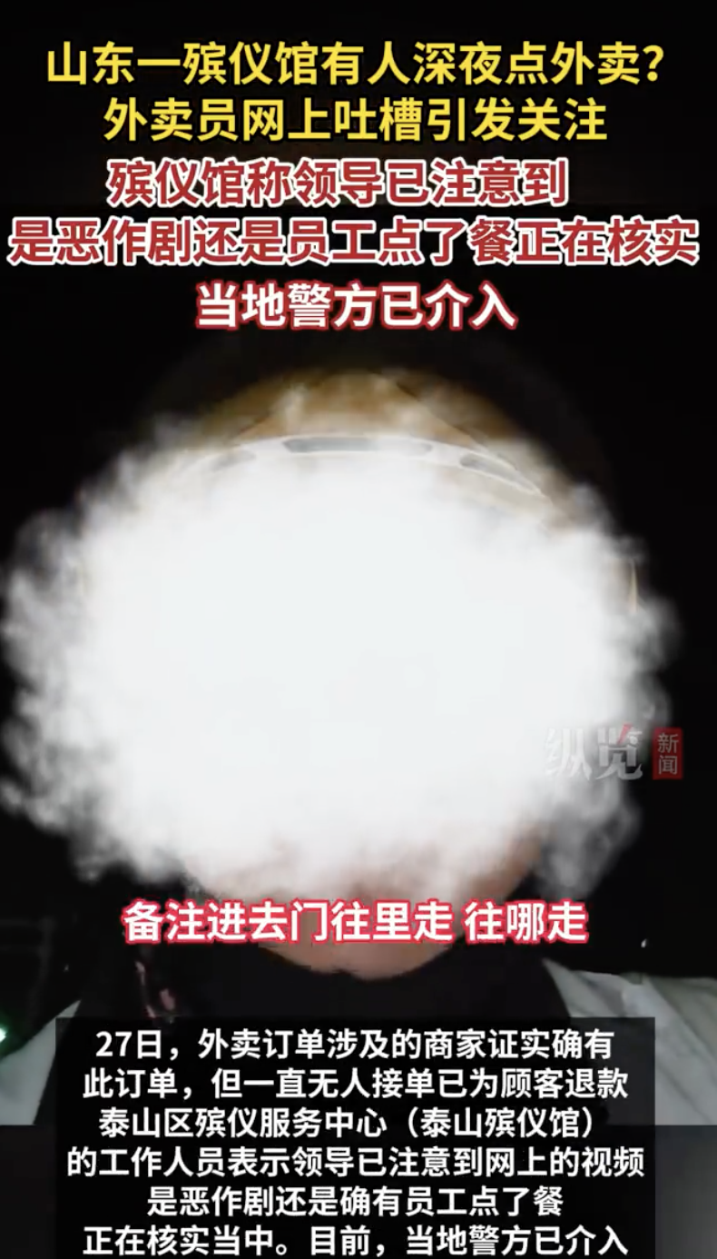 据纵览新闻,6月25日,一位外卖小哥吐槽殡仪馆员工深夜点外卖的视频引发网友热议。该外卖小哥晒出一张晚上11点24分,收货地为泰安市泰山殡仪馆的外卖配送订单,并喊话:殡仪馆领导管管你的员工,大半夜点什么柠檬水。27日,外卖订单涉及的商家证实确有此订单,但一直无人接单已为顾客退款。泰山区殡仪服务中心(泰山殡仪馆)的工作人员表示领导已注意到网上的视频,是恶作剧还是确有员工点了餐,正在核实当中。目前,当地警方已介入。