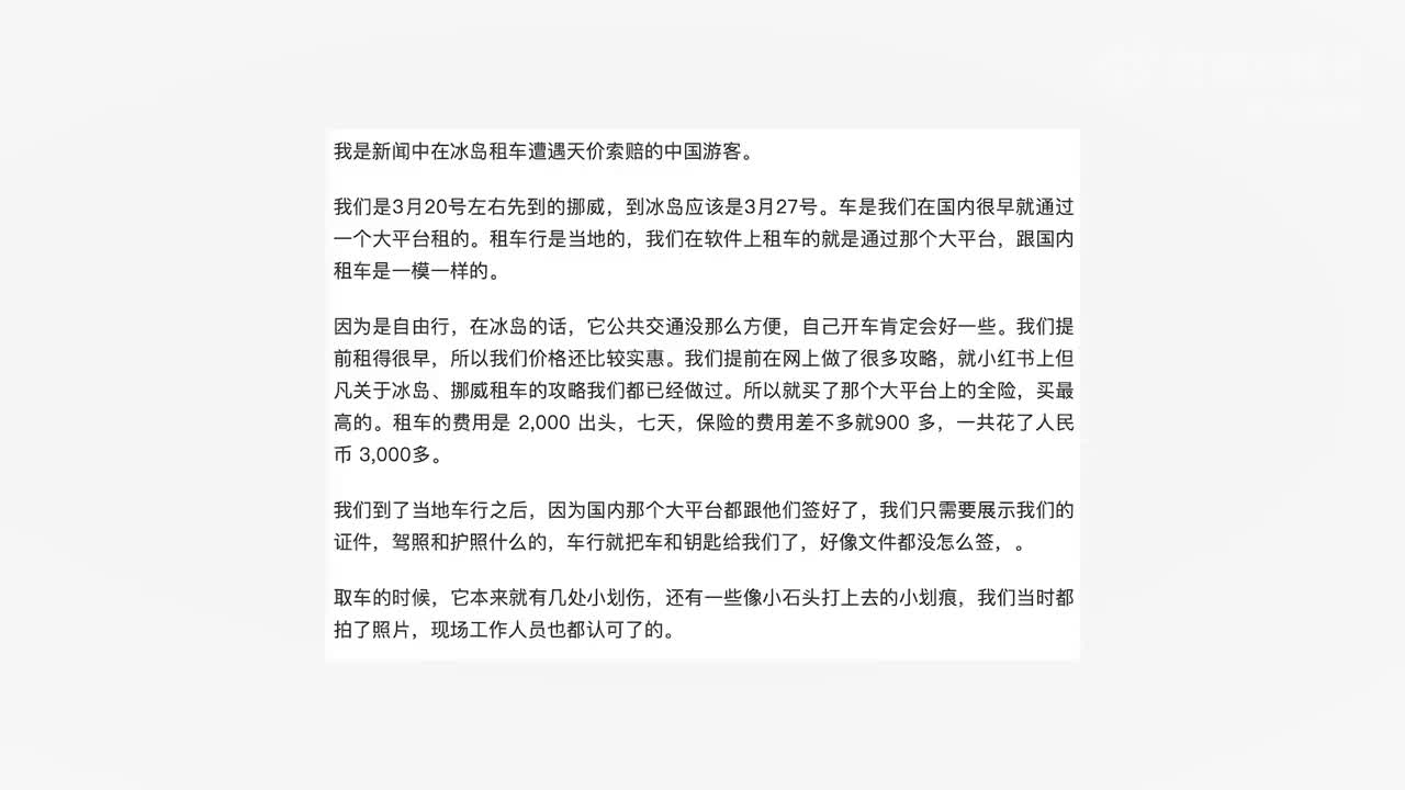 在冰岛租车遭天价索赔当事人发声:离飞机起飞前1个小时,被刷了4000美元,才让走。