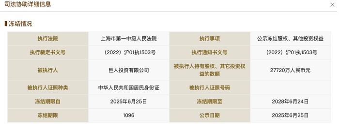 国家企业信用信息公示系统网站显示,6月25日,巨人投资有限公司新增一则股权冻结信息,股权所在企业为广西北部湾银行股份有限公司,冻结股权数额约2.77亿人民币,冻结期限自2025年6月25日至2028年6月24日,执行法院为上海市第一中级人民法院。