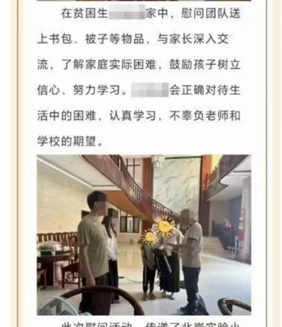 据红星新闻,7月2日,福建省莆田市湄洲湾北岸经济开发区实验小学微信公众号发布了一篇慰问贫困生的文章。这篇文章中配发的照片引发网友质疑。有网友表示,该名“贫困生”家里装修豪华,家中客厅明亮,还修建了前往二楼的楼梯,不像是条件困难的家庭。