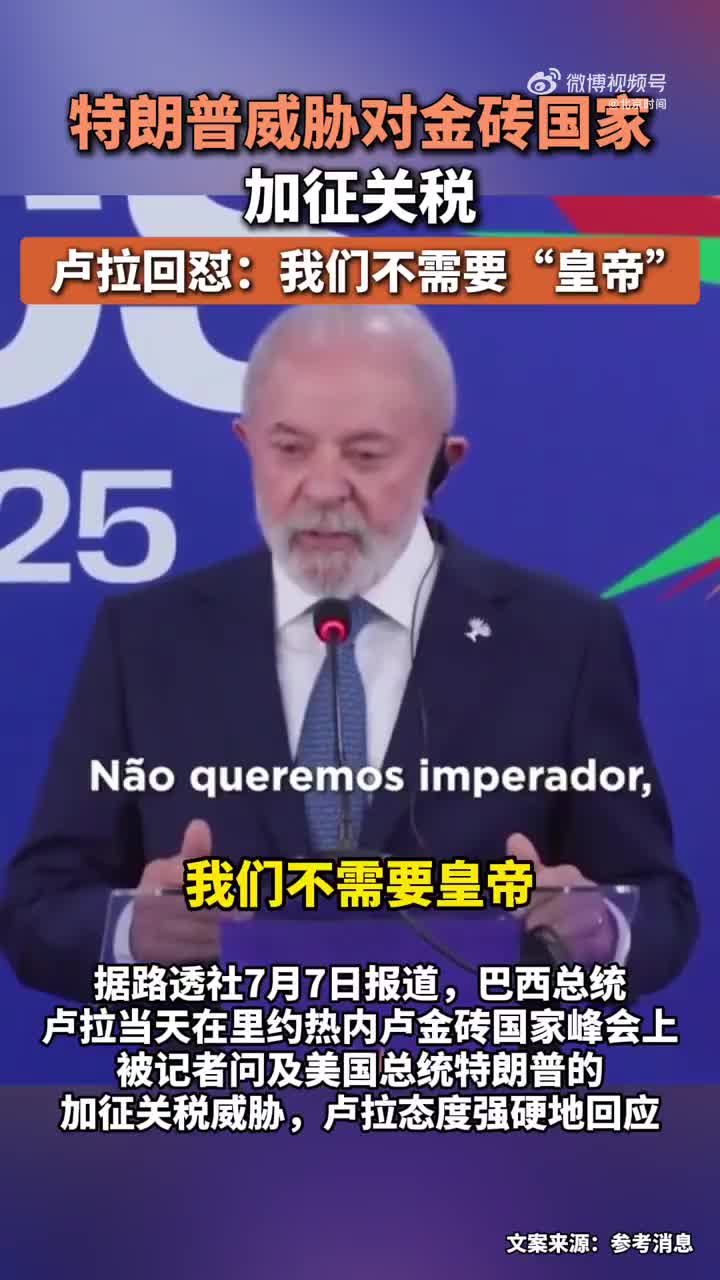 当地时间7月7日,在金砖国家领导人里约热内卢峰会后,巴西总统卢拉接受采访时猛批特朗普的威胁,他告诉记者:“世界已经变了,我们不需要一个皇帝。”卢拉强调,金砖国家想要从经济角度寻找另一种全球组织方式,这正是某些人感到不安的原因。 (via 北京时间)