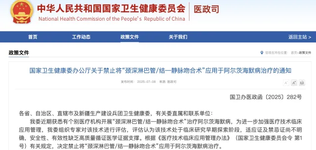 据广州日报,7月8日,国家卫健委发布《关于禁止将“颈深淋巴管/结—静脉吻合术”应用于阿尔茨海默病治疗的通知》。根据这份通知,国家卫健委组织专家对该技术进行评估,评估认为该技术处于临床研究早期探索阶段,适应证及禁忌证尚不明确,安全性、有效性缺乏高质量循证医学证据支撑。根据《医疗技术临床应用管理办法》(国家卫生健康委员会令 第1号)有关规定,决定禁止将“颈深淋巴管/结—静脉吻合术”应用于阿尔茨海默病治疗。
