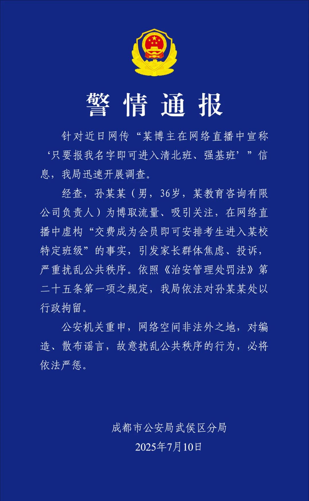 某博主直播谎称保送清北班,成都警方:行拘。