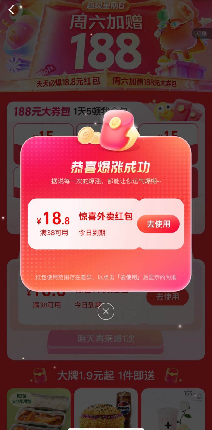 外卖员口中的大额减免券即淘宝闪购今日发放的外卖红包。该红包满38元可减免18.8元,但仅限当日使用。同时还加赠188元大券包,可使用时段覆盖早午晚餐等,其中部分红包7月13日也可使用。