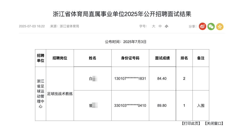 浙江体育局通报“招足球教练要博士”:取消入围考生招聘资格。