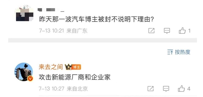 7月13日,有网友在微博CEO王高飞@来去之间 评论区提问:“昨天那一波汽车博主被封不说明下理由?”王高飞回答:“攻击新能源厂商和企业家。”