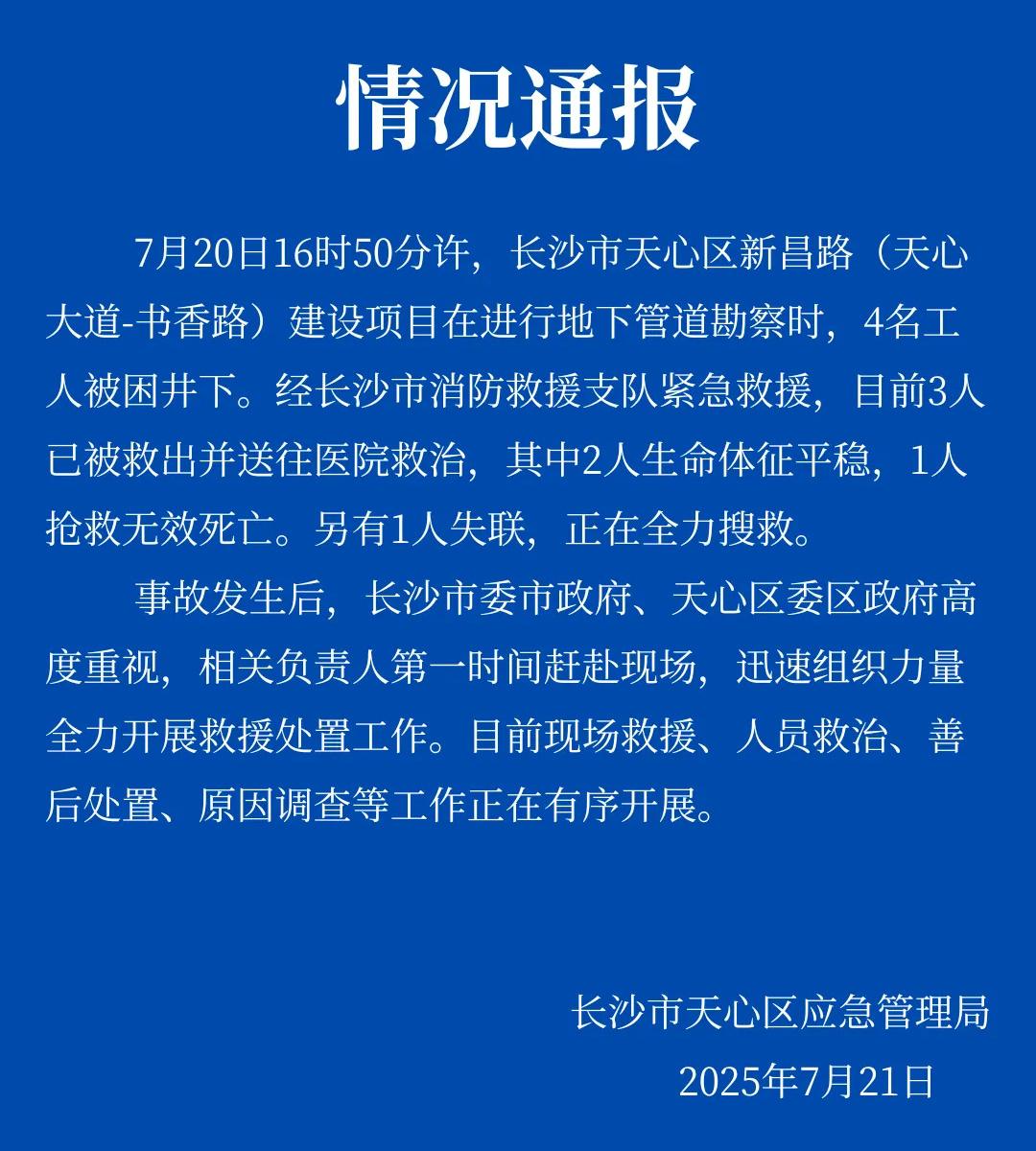 据界面新闻,7月21日,湖南长沙市天心区应急管理局通报:7月20日16时50分许,长沙市天心区新昌路(天心大道-书香路)建设项目在进行地下管道勘察时,4名工人被困井下。经长沙市消防救援支队紧急救援,目前3人已被救出并送往医院救治,其中2人生命体征平稳,1人抢救无效死亡。另有1人失联,正在全力搜救。目前现场救援、人员救治、善后处置、原因调查等工作正在有序开展。