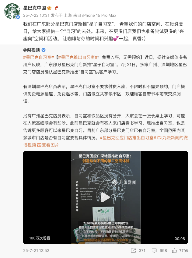 星巴克中国回应广东部分门店新推“星子自习室”。