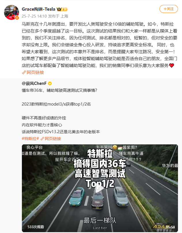 特斯拉副总裁陶琳回应懂车帝测试:特斯拉已经在多个季度超越“比人类驾驶安全10倍的辅助驾驶”这一目标。