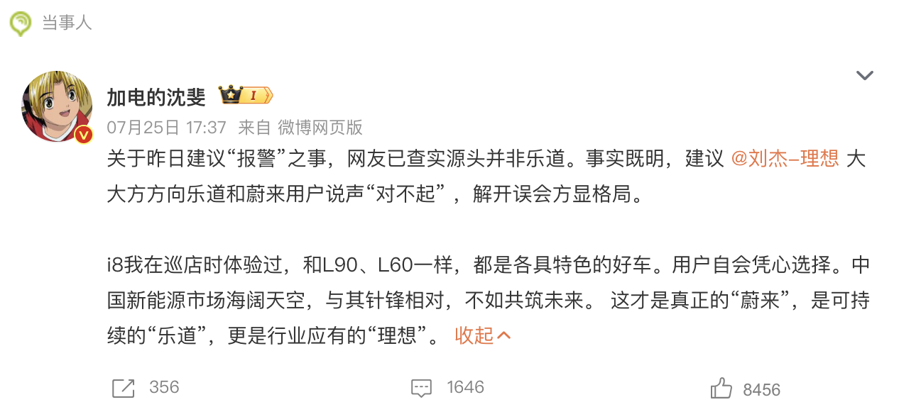 抹黑理想i8竟是自家用户,沈斐建议理想向乐道用户道歉。