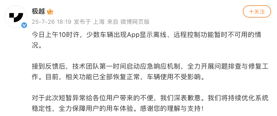 7月26日,极越汽车发文称,今日上午10时许,少数车辆出现App显示离线、远程控制功能暂时不可用的情况。接到反馈后,技术团队第一时间启动应急响应机制,全力开展问题排查与修复工作。目前,相关功能已全部恢复正常,车辆使用不受影响。对于此次短暂异常给各位用户带来的不便,我们深表歉意。我们将持续优化系统稳定性,全力保障用户的用车体验。