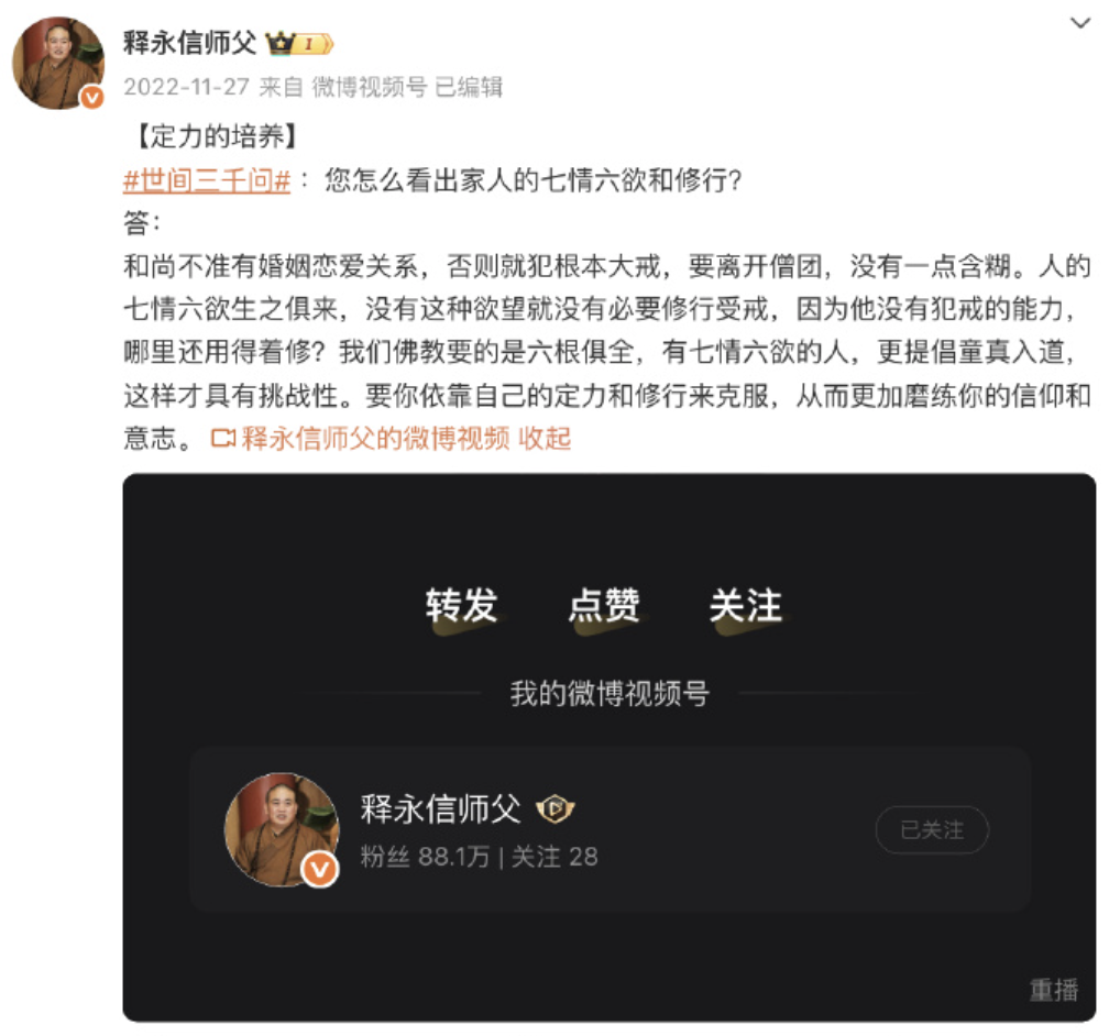 @释永信师父 曾在22年回答“怎么看出家人的七情六欲和修行”:“和尚不准有婚姻恋爱关系,否则就犯根本大戒,要离开僧团,没有一点含糊。人的七情六欲生之俱来,没有这种欲望就没有必要修行受戒,因为他没有犯戒的能力,哪里还用得着修?我们佛教要的是六根俱全,有七情六欲的人,更提倡童真入道,这样才具有挑战性。要你依靠自己的定力和修行来克服,从而更加磨练你的信仰和意志。 ”