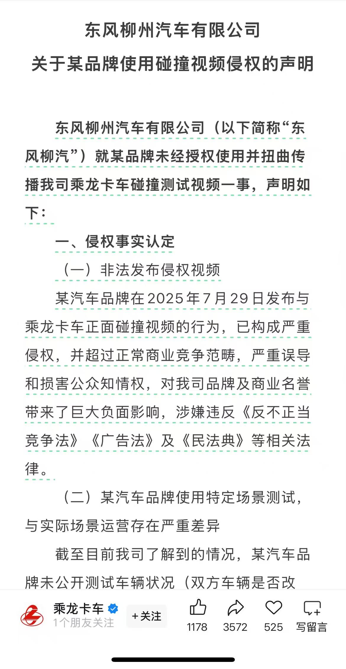 乘龙卡车表示:“某汽车品牌在2025年7月29日发布与乘龙卡车正面碰撞视频的行为,已构成严重侵权,并超过正常商业竞争范畴,严重误导和损害公众知情权,对我司品牌及商业名誉带来了巨大负面影响,涉嫌违反《反不正当竞争法》《广告法》及《民法典》等相关法律。截至目前我司了解到的情况,某汽车品牌未公开测试车辆状况(双方车辆是否改装、减配、卡扣是否固定、车辆是否过检等)、场景环境(测试场地状况、车速、驾驶状态等),通过自定义碰撞条件,特定设计非常规测试场景,发布与公众认知的正常碰撞结果偏差较大的碰撞视频,不仅贬低我司品牌形象,还容易对广大车主造成误导,形成安全隐患。”