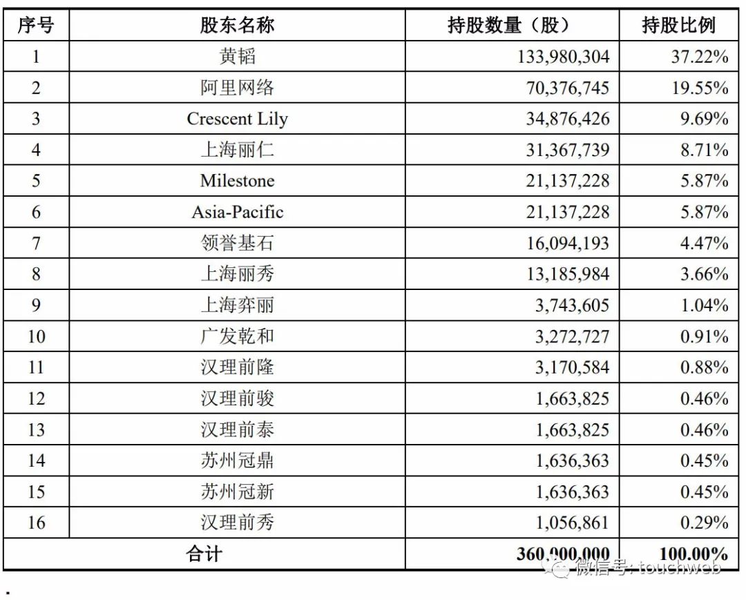 IPO前,丽人丽妆股东黄韬持股为37.22%,通过上海丽仁间接持股为0.13%,合计持股为37.35%,为公司大股东。阿里巴巴持股为19.55%,为第二大股东;Crescent Lily Singapore Pte. Ltd.持股为9.69%。