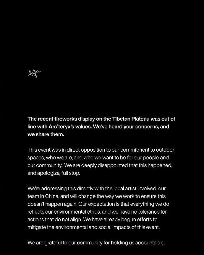 现代快报记者注意到,始祖鸟海外社媒也发了英文致歉信,不过内容与国内版本有差异。海外版称对青藏高原烟花表演深感遗憾,此行为与品牌环保价值观及期望不符,郑重致歉。同时,还提到“正与相关艺术家和中国团队沟通,调整工作方式避免类似情况”。
