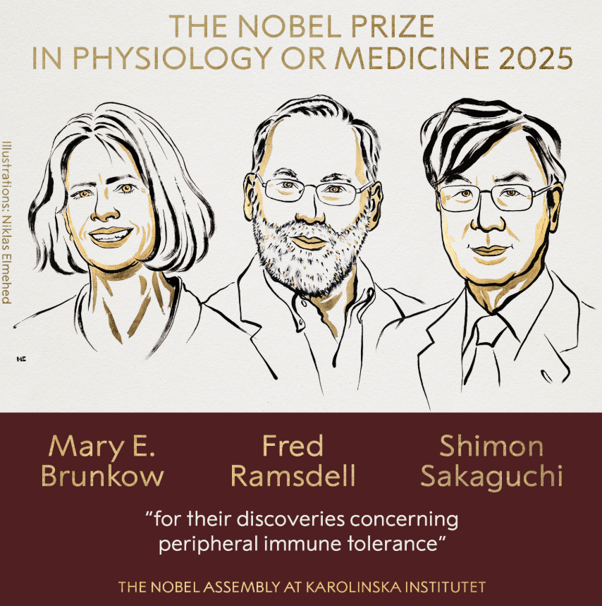 2025年诺贝尔生理学或医学奖公布。当地时间10月6日,瑞典卡罗琳医学院宣布,将2025年诺贝尔生理学或医学奖授予玛丽·E·布伦科、弗雷德·拉姆斯德尔和坂口志文,以表彰他们在外周免疫耐受领域的重要发现。