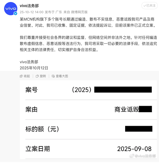 vivo法务部:已就某MCN机构散布不实信息提起诉讼。