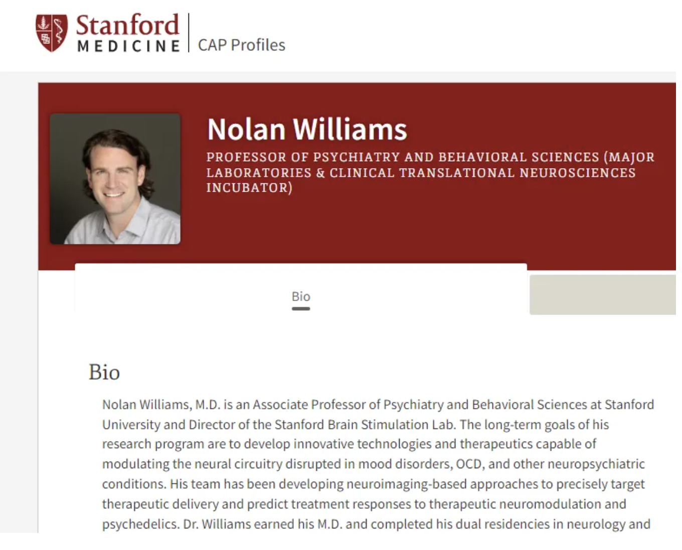 公开资料显示,威廉姆斯担任斯坦福脑刺激实验室主任及介入精神病学临床研究主任,被业界同行视为“耀眼明星”。他的研究项目的长期目标是开发创新技术和疗法,以调节情绪障碍、强迫症和其他神经精神疾病中被破坏的神经回路。