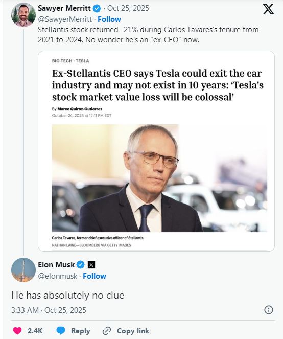 前斯特兰蒂斯CEO称特斯拉10年后可能不复存在,马斯克回应。